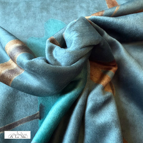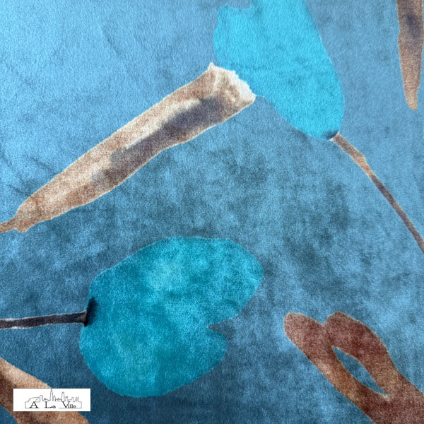De stof heeft een blauwgrijze basis met daarop een groot en rustig plantenmotief. De bloemen zijn in het appelblauwzeegroen en de takjes in beige en bruine tinten.