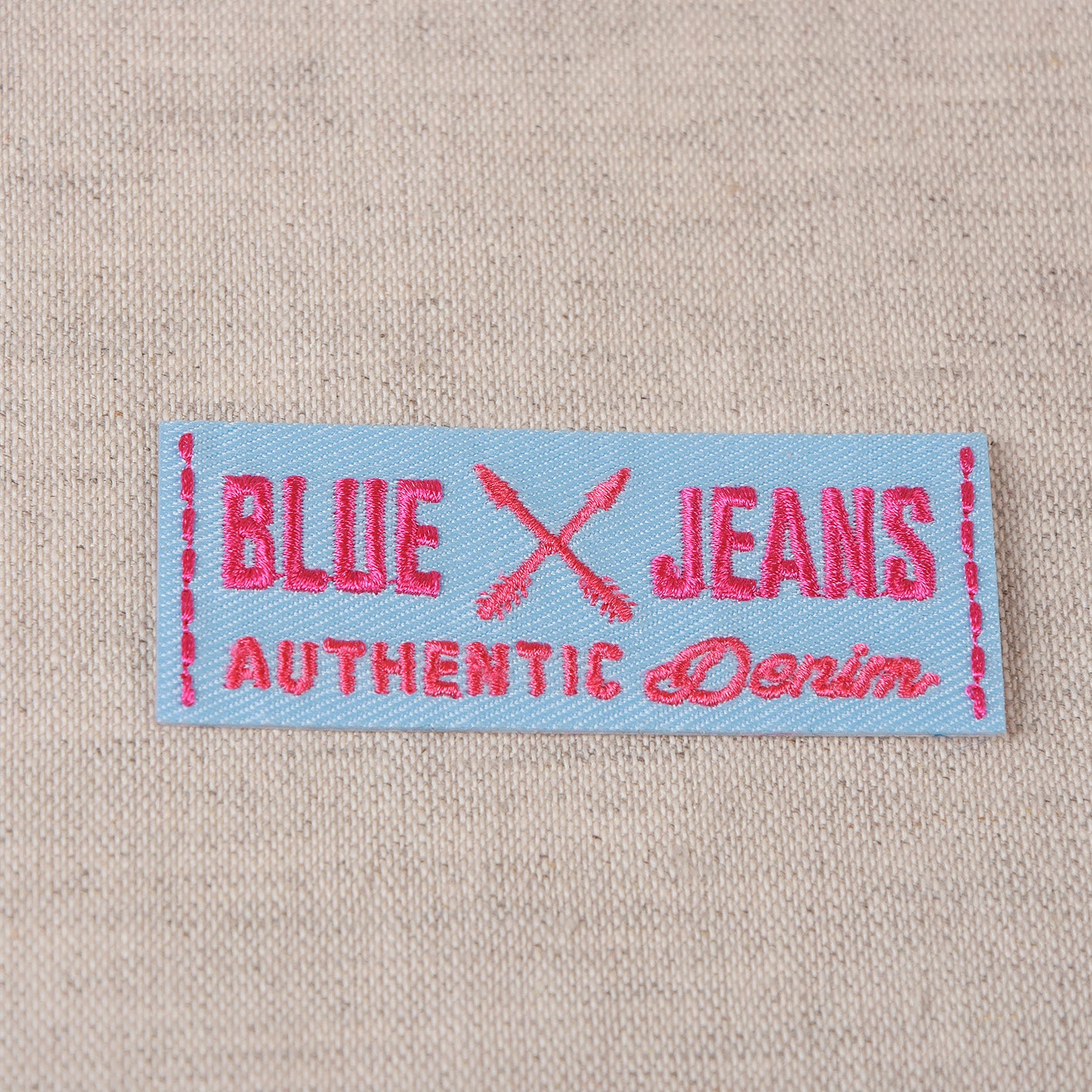 Dit is een langwerpige patch die lijkt op een naailabel. De basis is lichtblauw met daarop felroze letters.