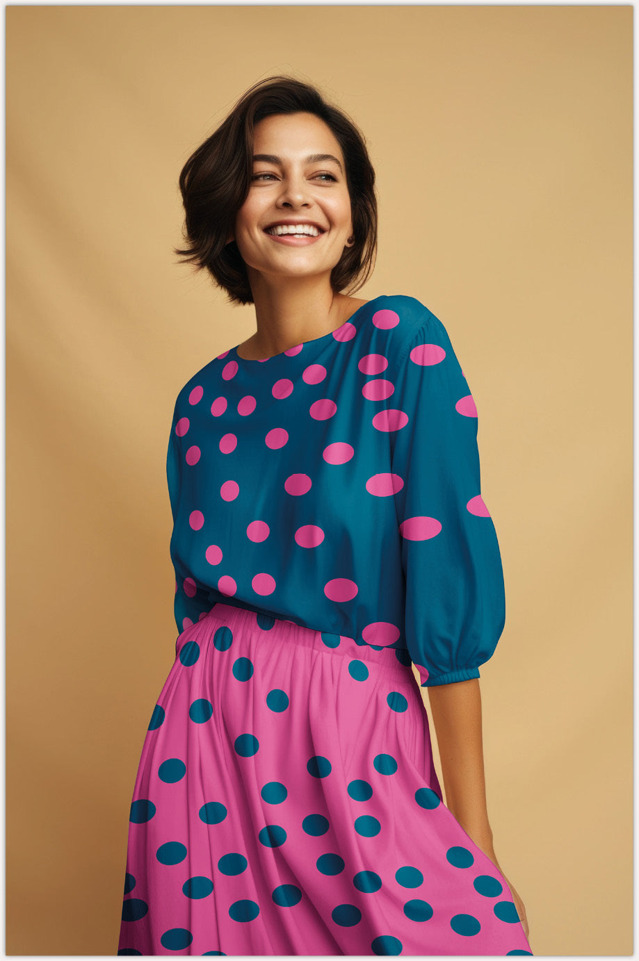 De stof heeft een donkerblauwe basis met daarop grote, paars-roze bollen in een onregelmatig patroon.