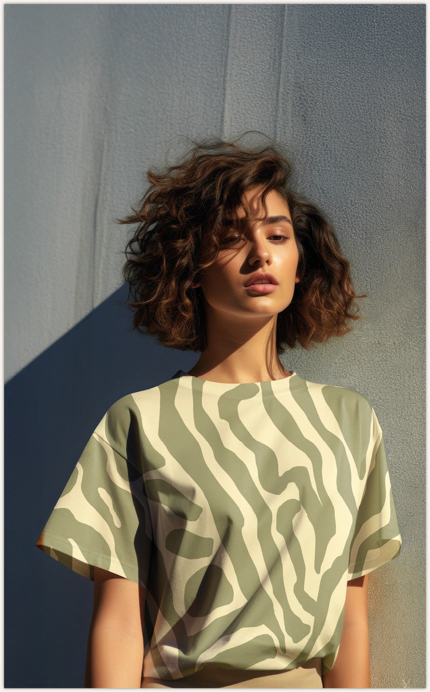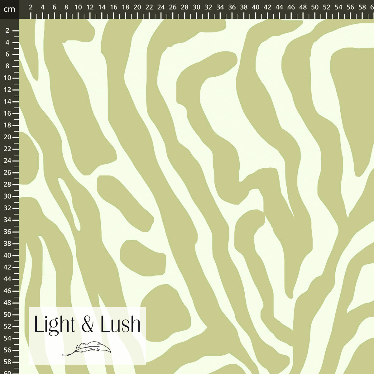 De stof heeft een patroon van kronkelende lijnen, op zeer grote schaal. De basis van de stof is licht vanille met daarop een zacht, licht, warm groen.