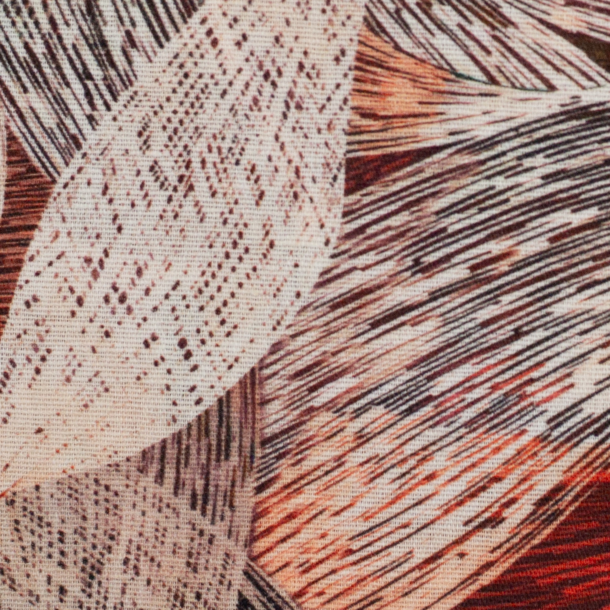 Deze stof heeft een geometrisch lijnenmotief in allerhande donkere, warme kleuren: aubergine, bordeaux, rood, roest, koraal en zalm, afgewisseld met donkergroen en gebroken wit.