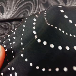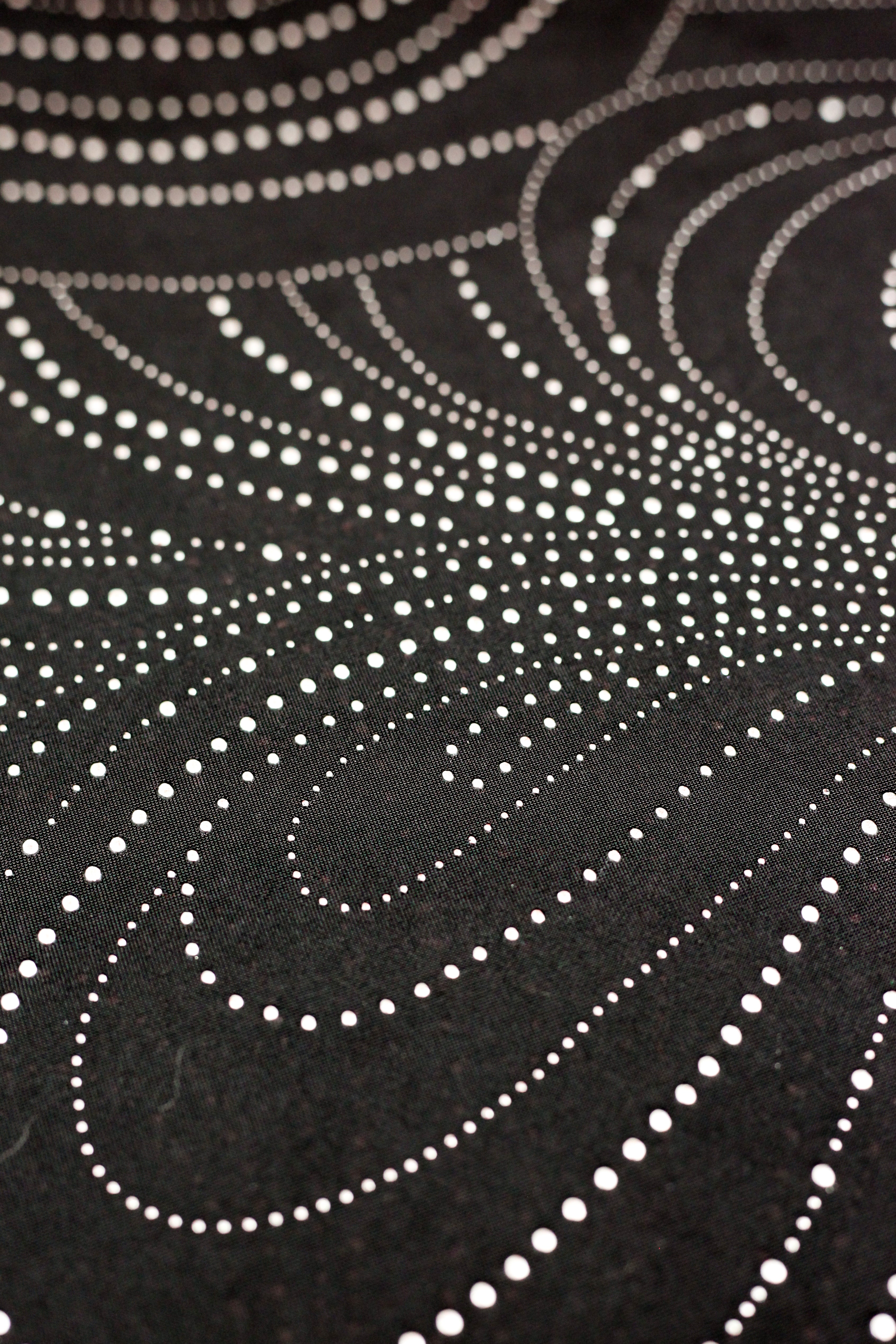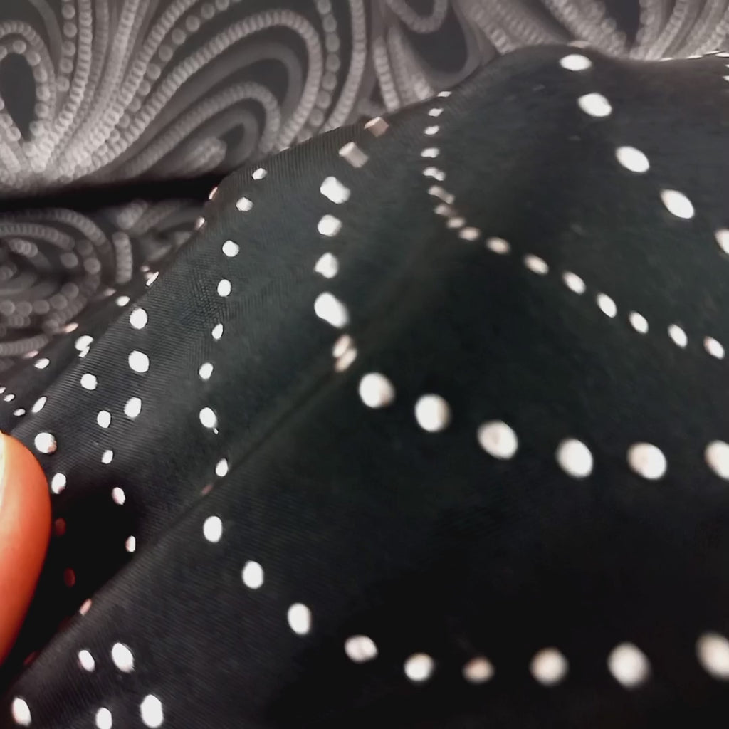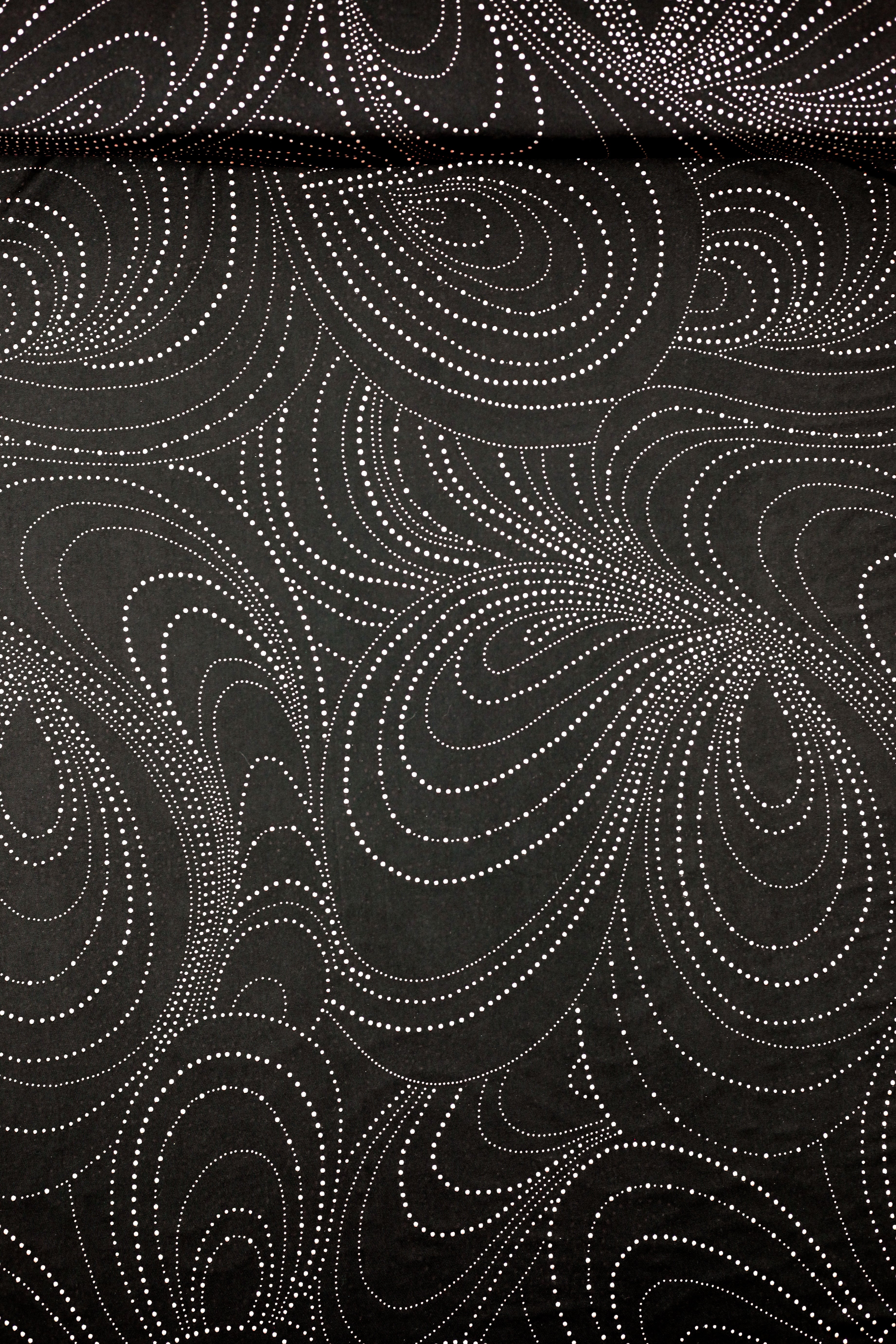 Dit is een zwarte lycra met daarop fijne metallic steentjes in het zilver. De steentjes zijn bevestigd in een groot motief van concentrische druppelvormen. De steentjes zijn lichtjes in 3D, maar niet overdreven.