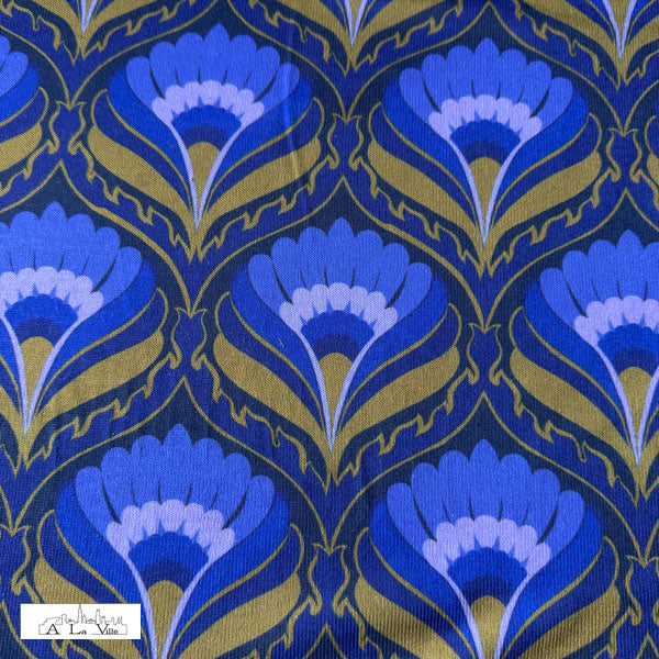 De stof is dun, licht en rekbaar. De stof heeft een geometrisch bloemenpatroon in donkere tinten: indigo, donkerblauw, paars en oker.