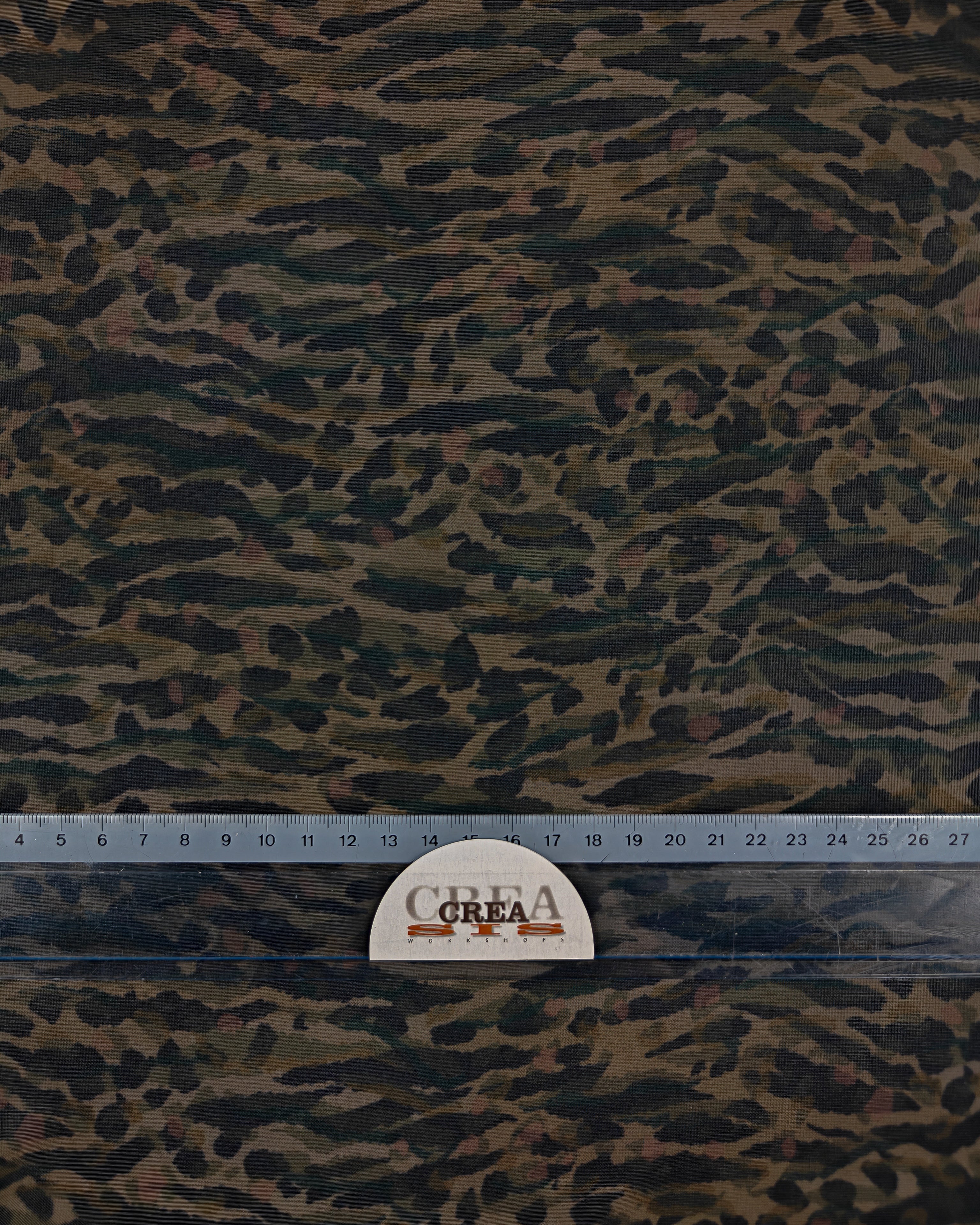 De stof heeft een legerachtige print in verschillende donkere tinten khaki en bruin.