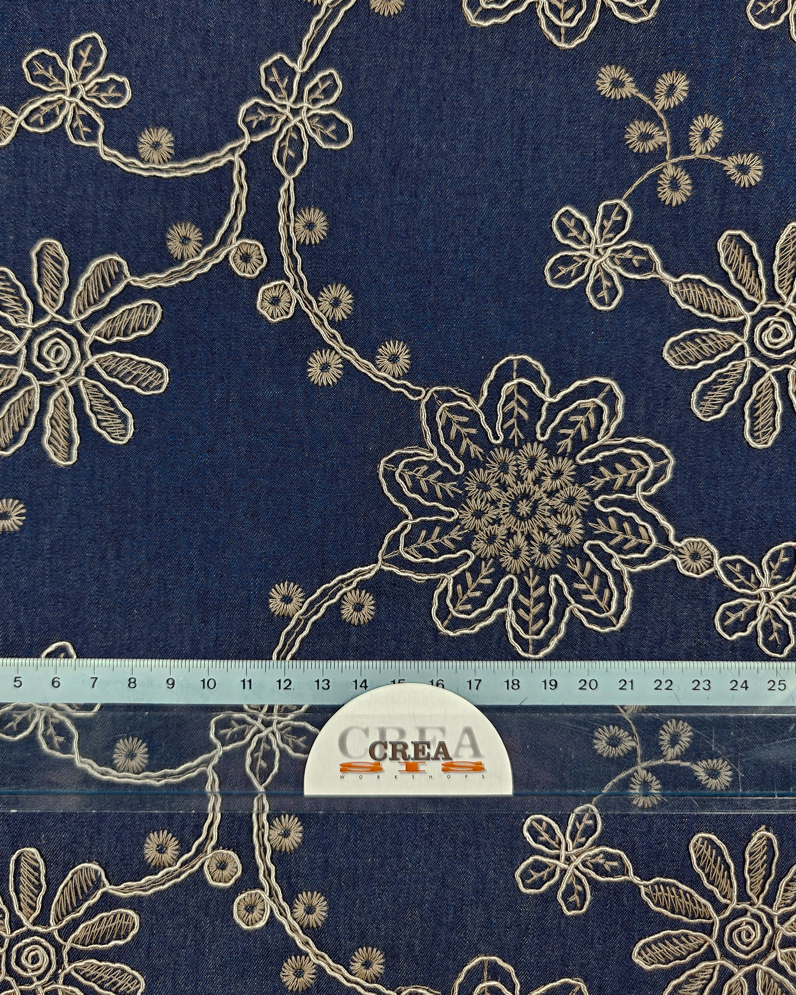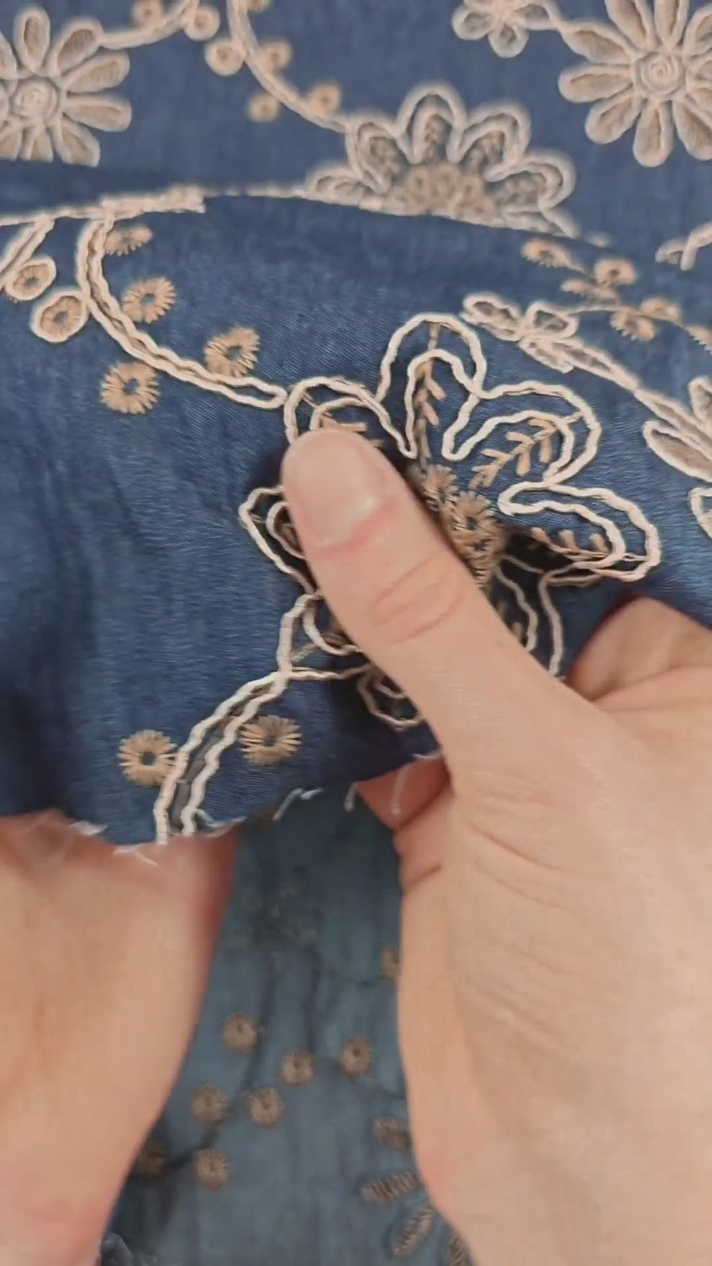 Dit is een donkere jeans (niet-rekbaar) met borduurwerk uit de collectie van À La Ville. De jeans is een echt donkerblauw, met daarop een fijne, satijndraad geborduurd in een bloemenmotief. Daartussen is ook geborduurd met een donkerbeige.