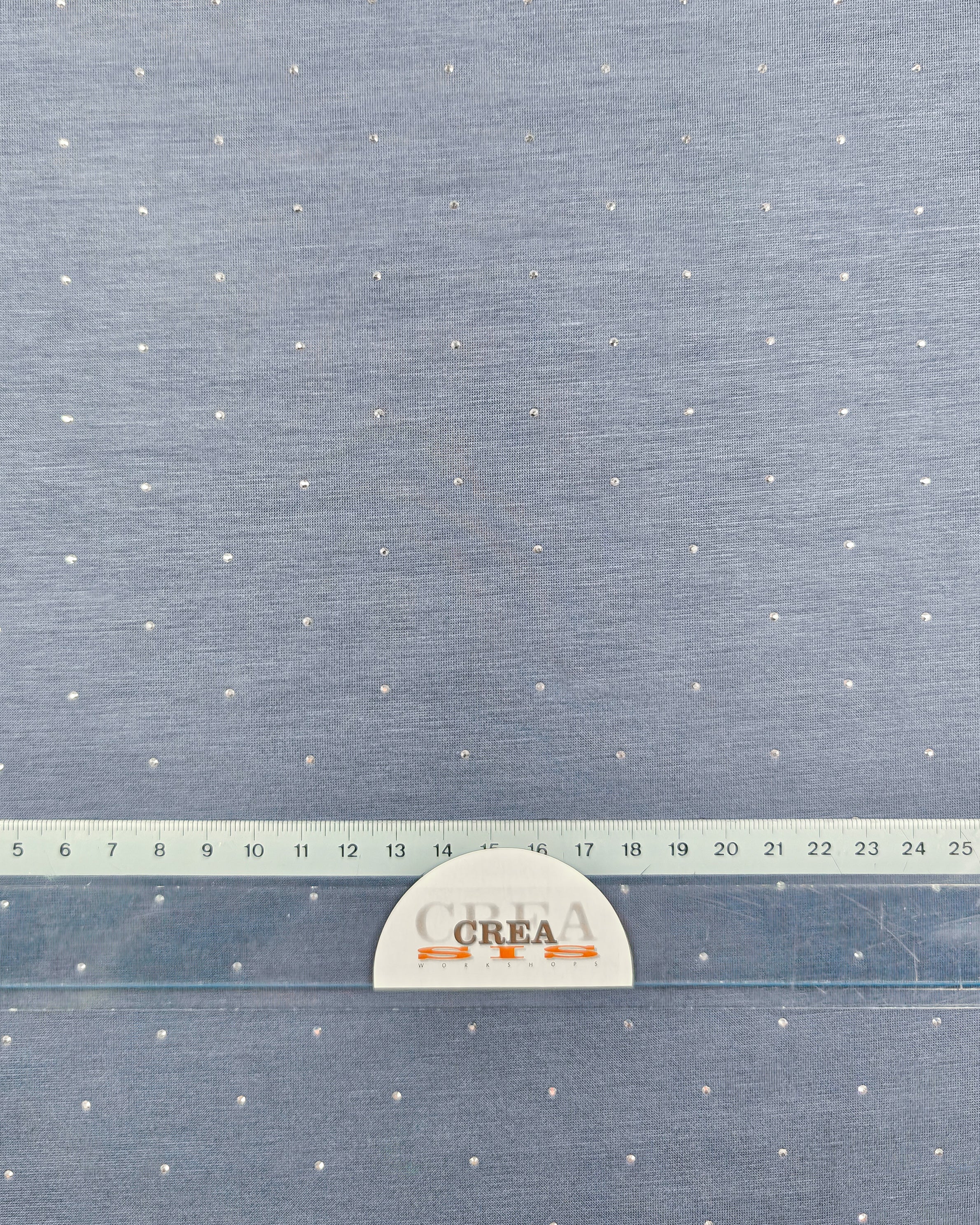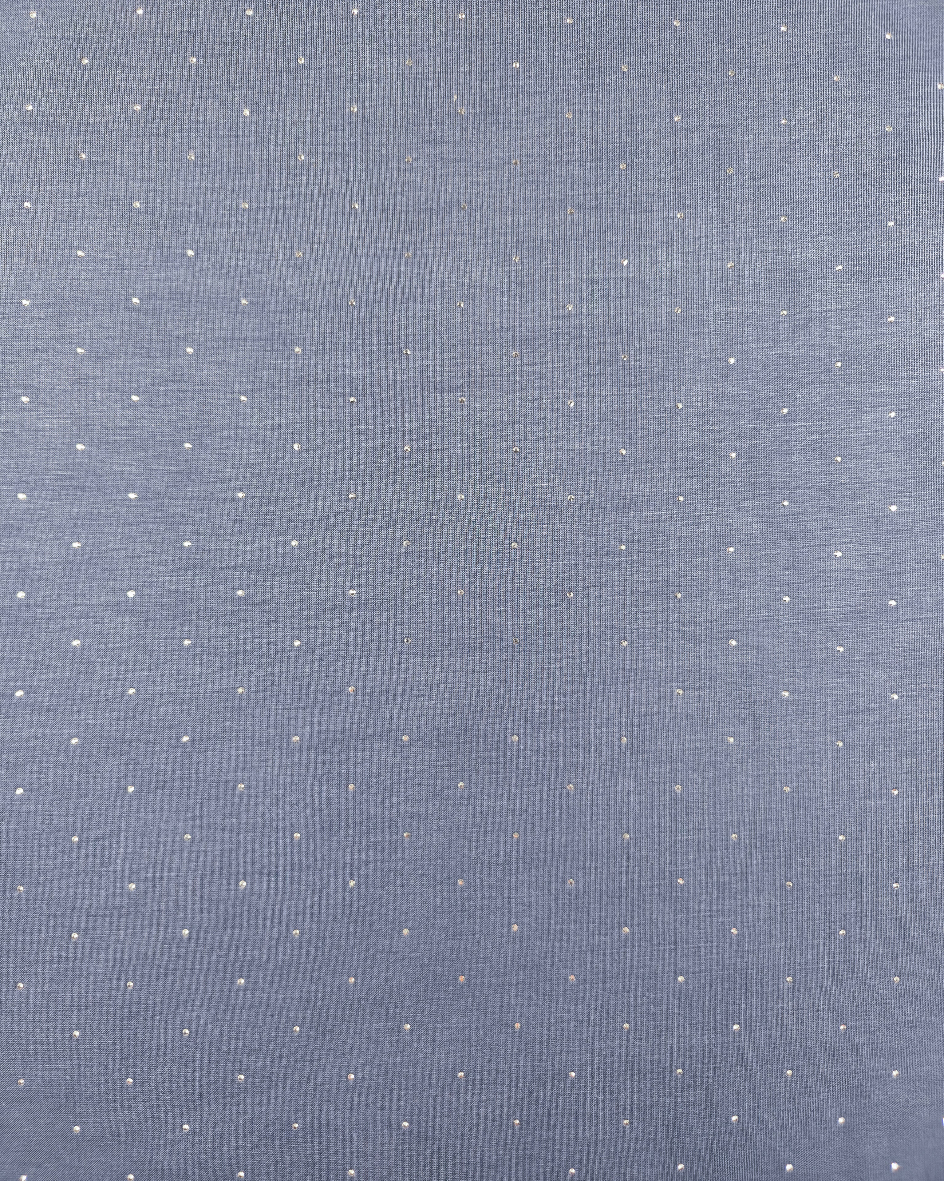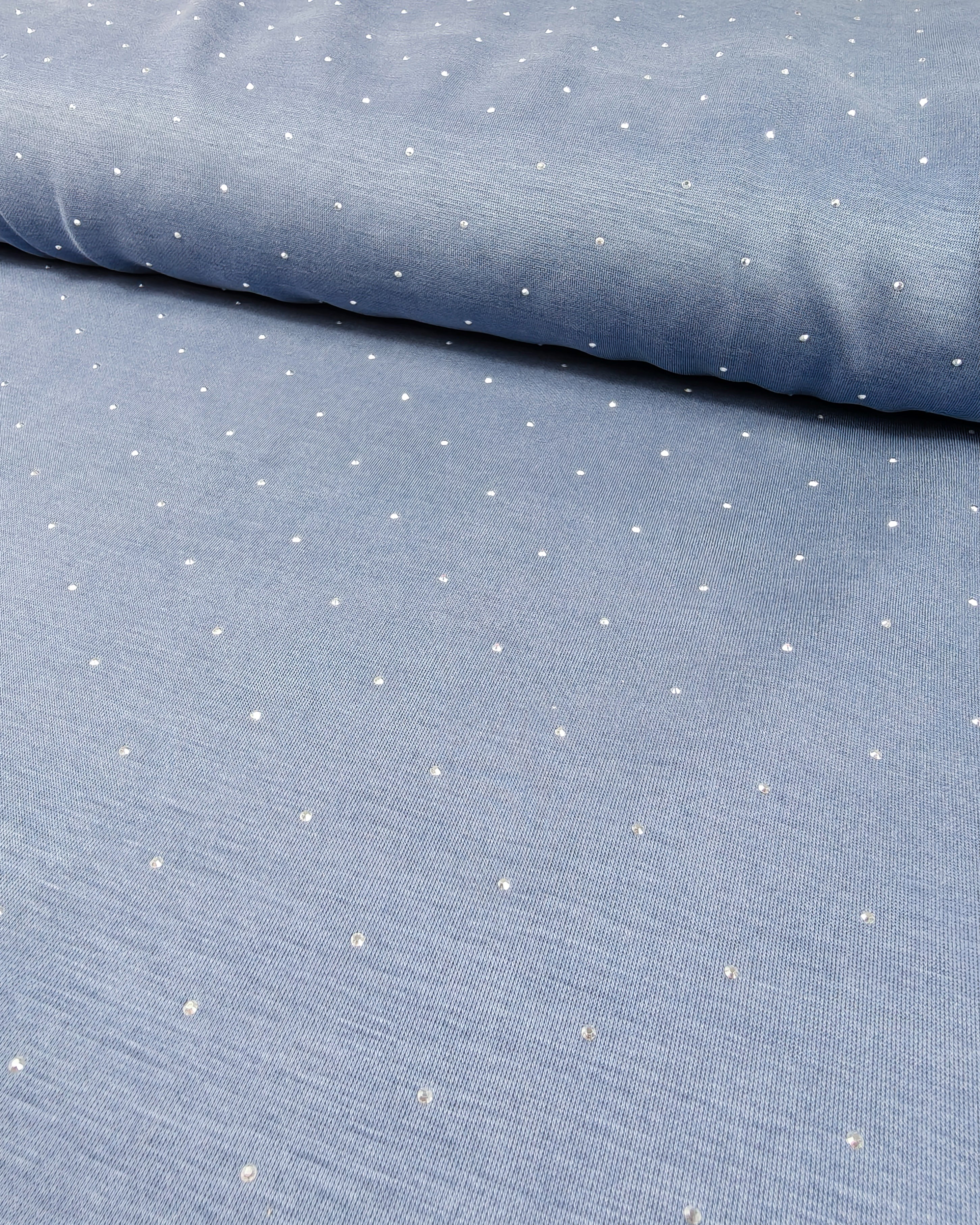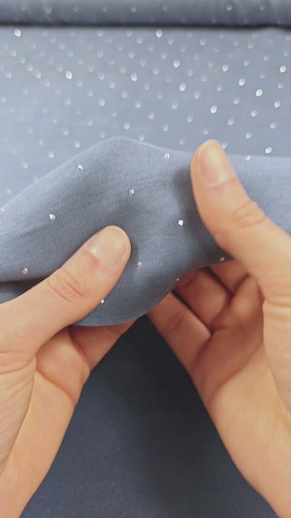 Deze stof is effen grijsblauw met daarop kleine, zilveren strass-steentjes.