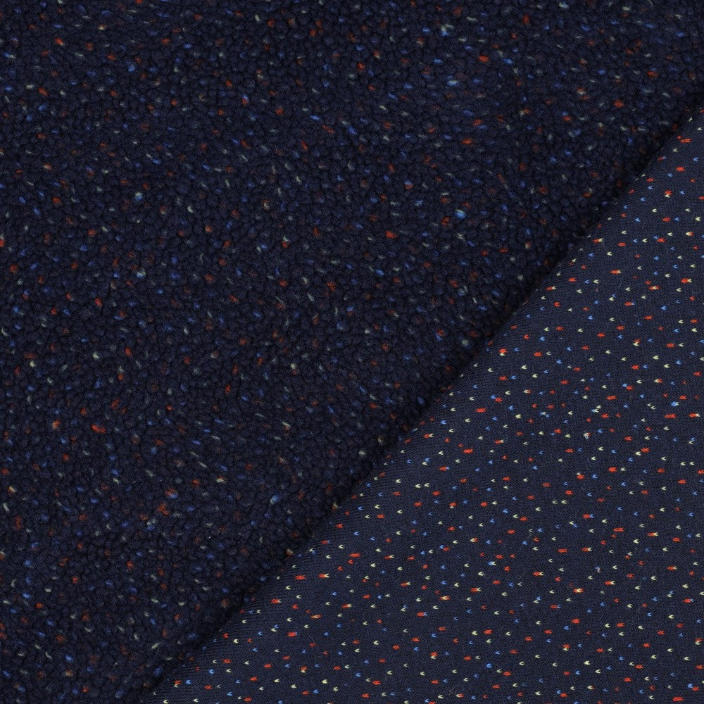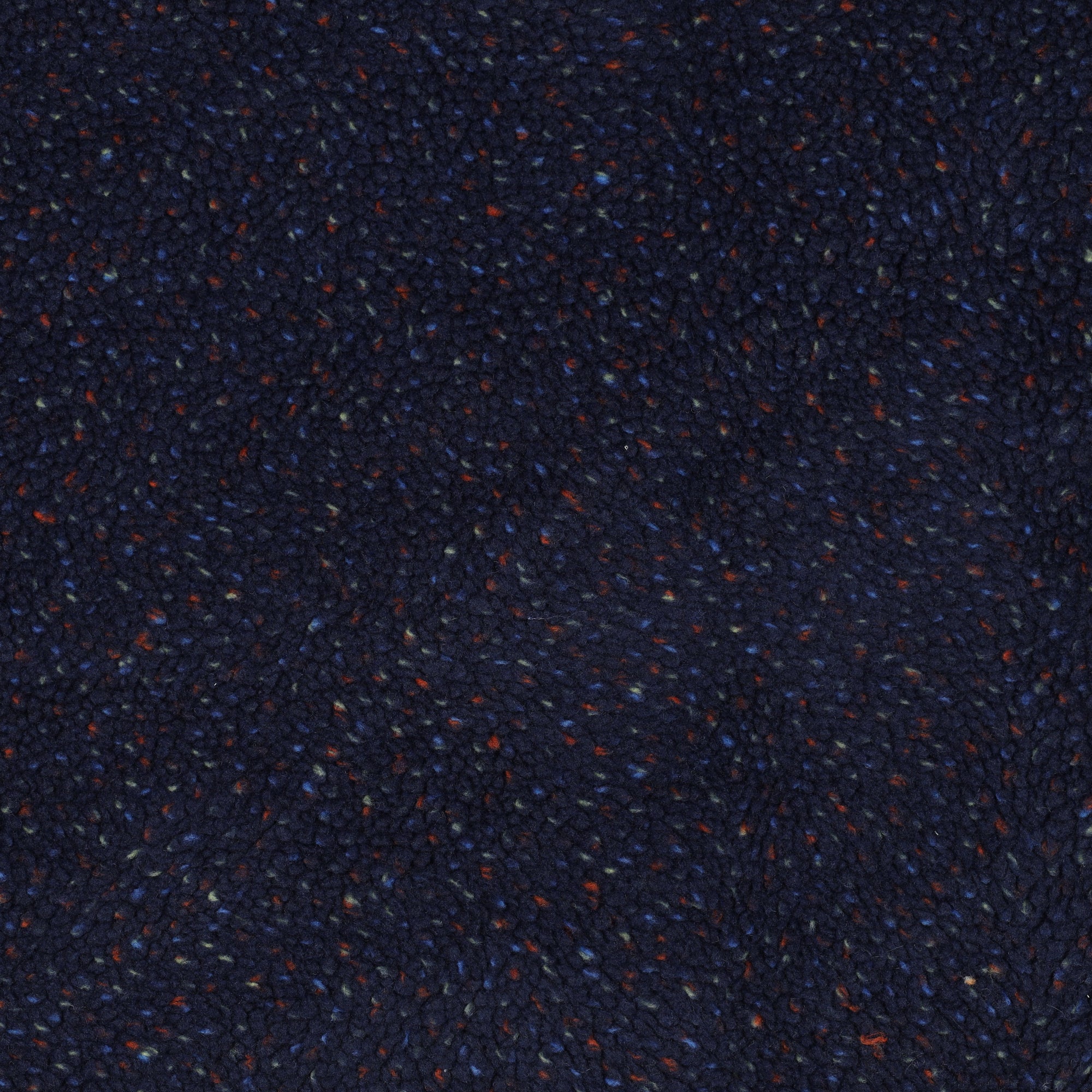 Deze stof is donkerblauw met spikkels in lichtblauw, roest en geel.