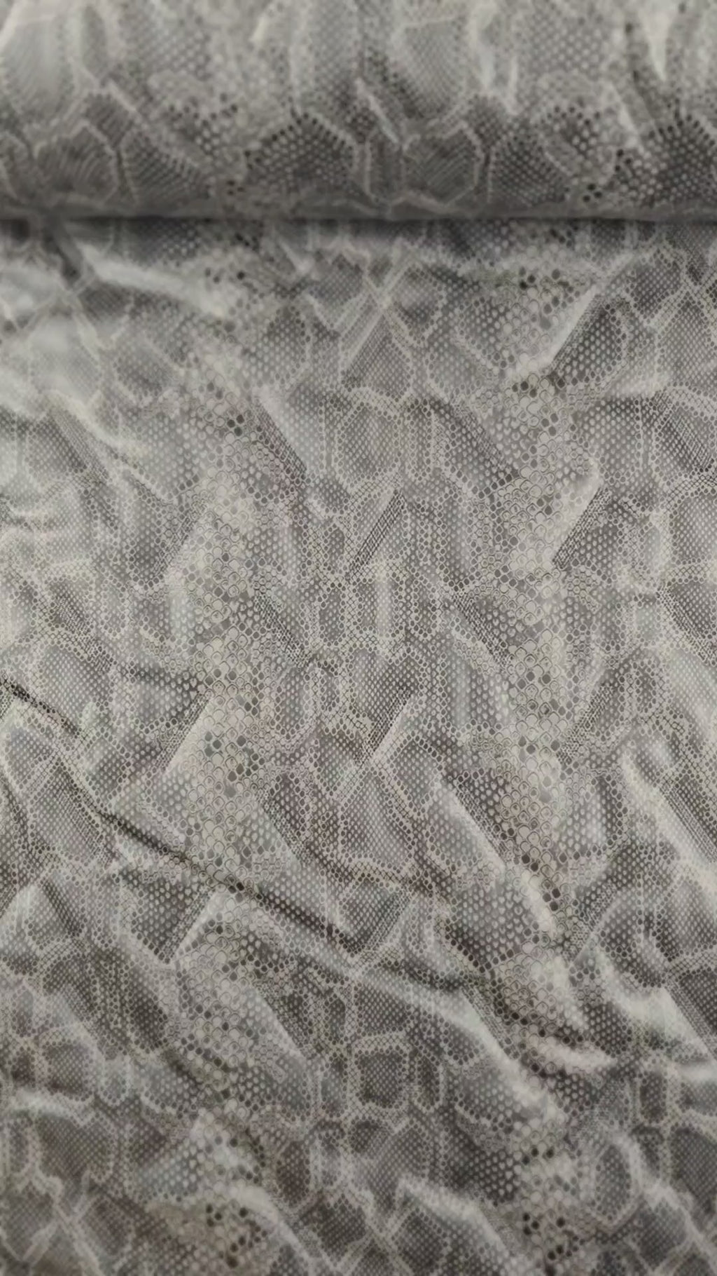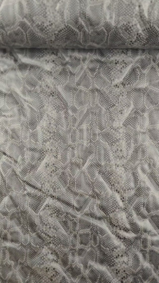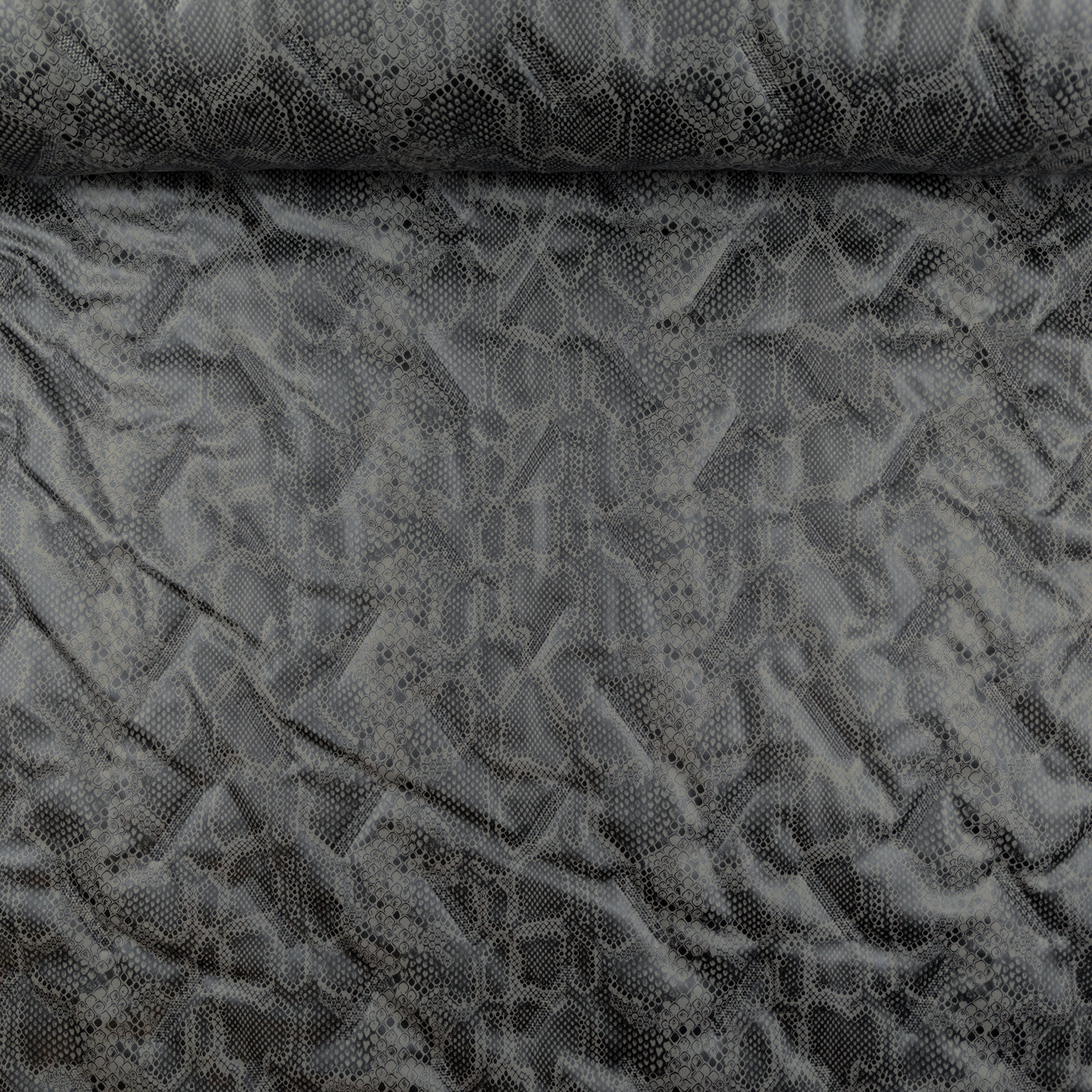 De stof heeft het motief van een reptielenhuid in zwart, donkergrijs en taupe. De stof komt uit de collectie van À La Ville. Dit merk specialiseert in prachtige, kwalitatieve modestoffen, meestal vervaardigd in Europa.