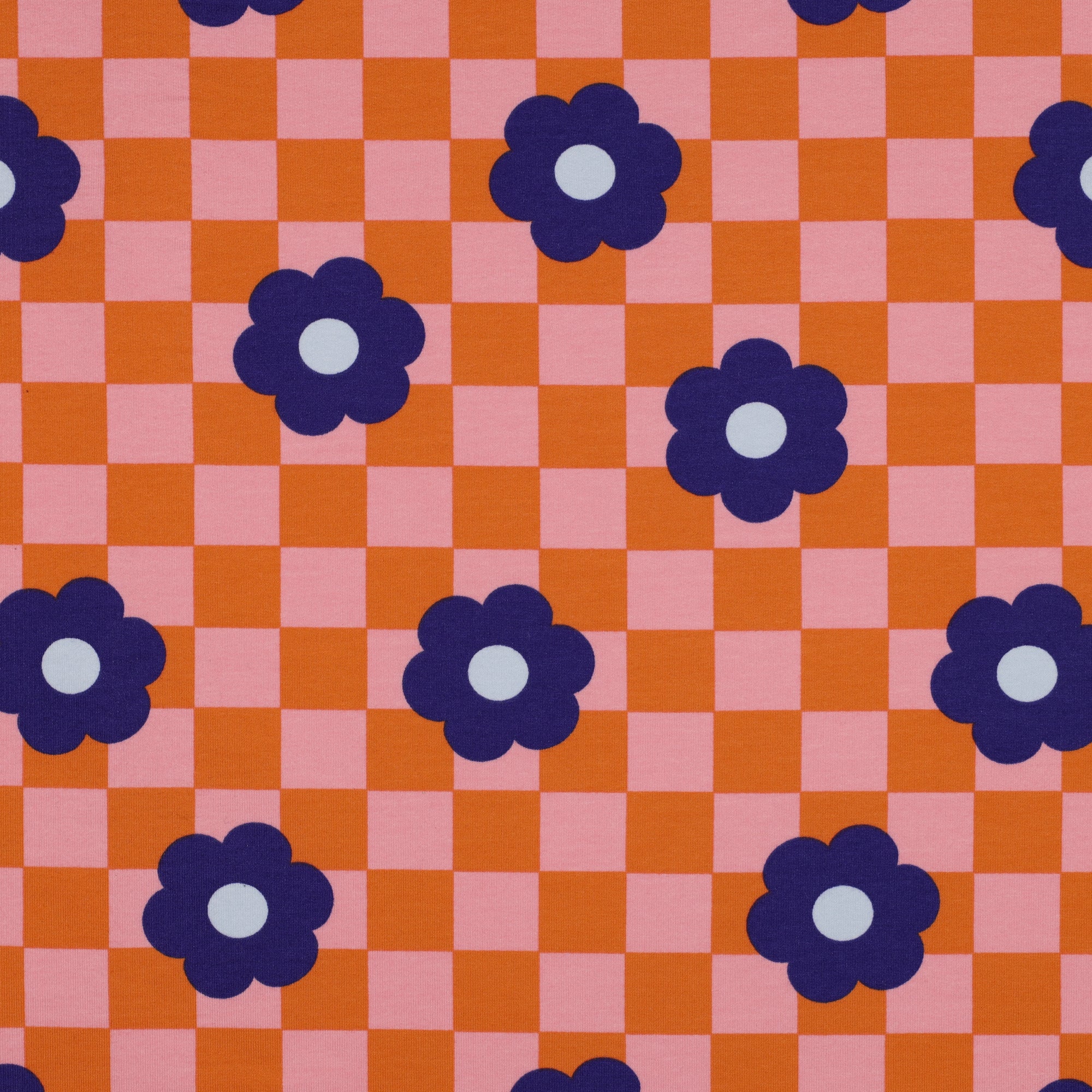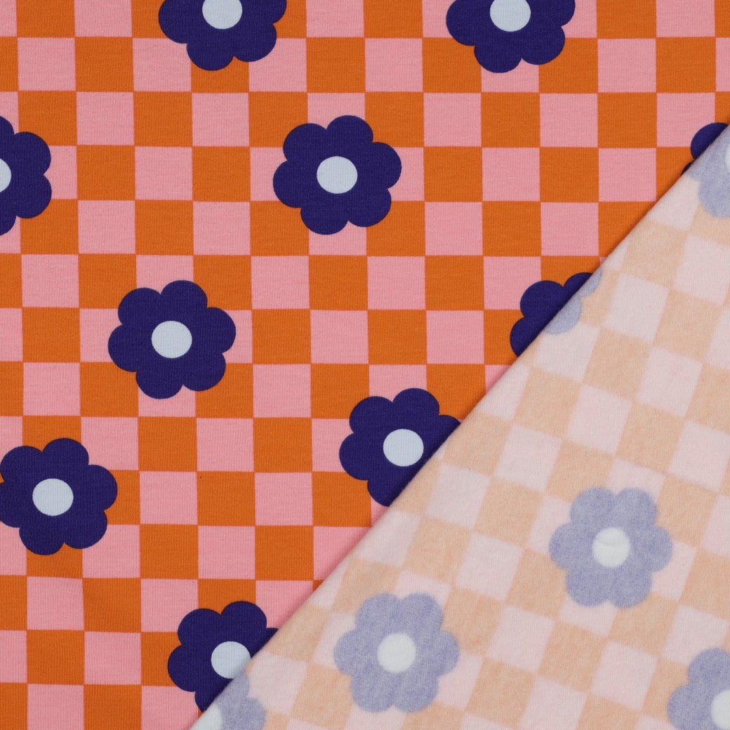 Deze stof is heeft een dambordpatroon in zachtroze en -oranje met daarop grote bloemen in donkerblauw, met een lichtblauw hartje.