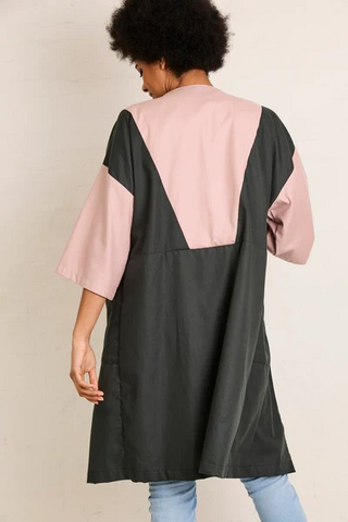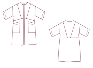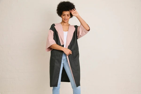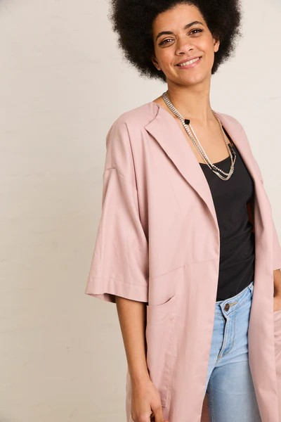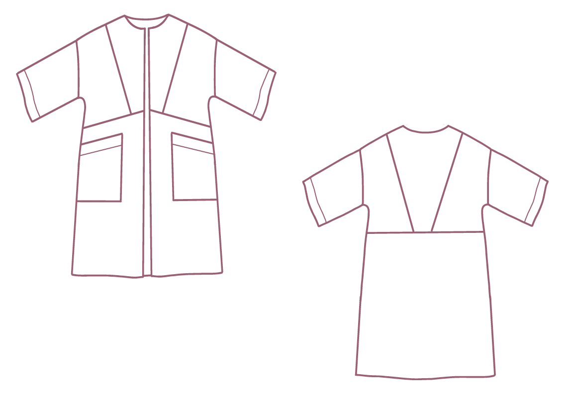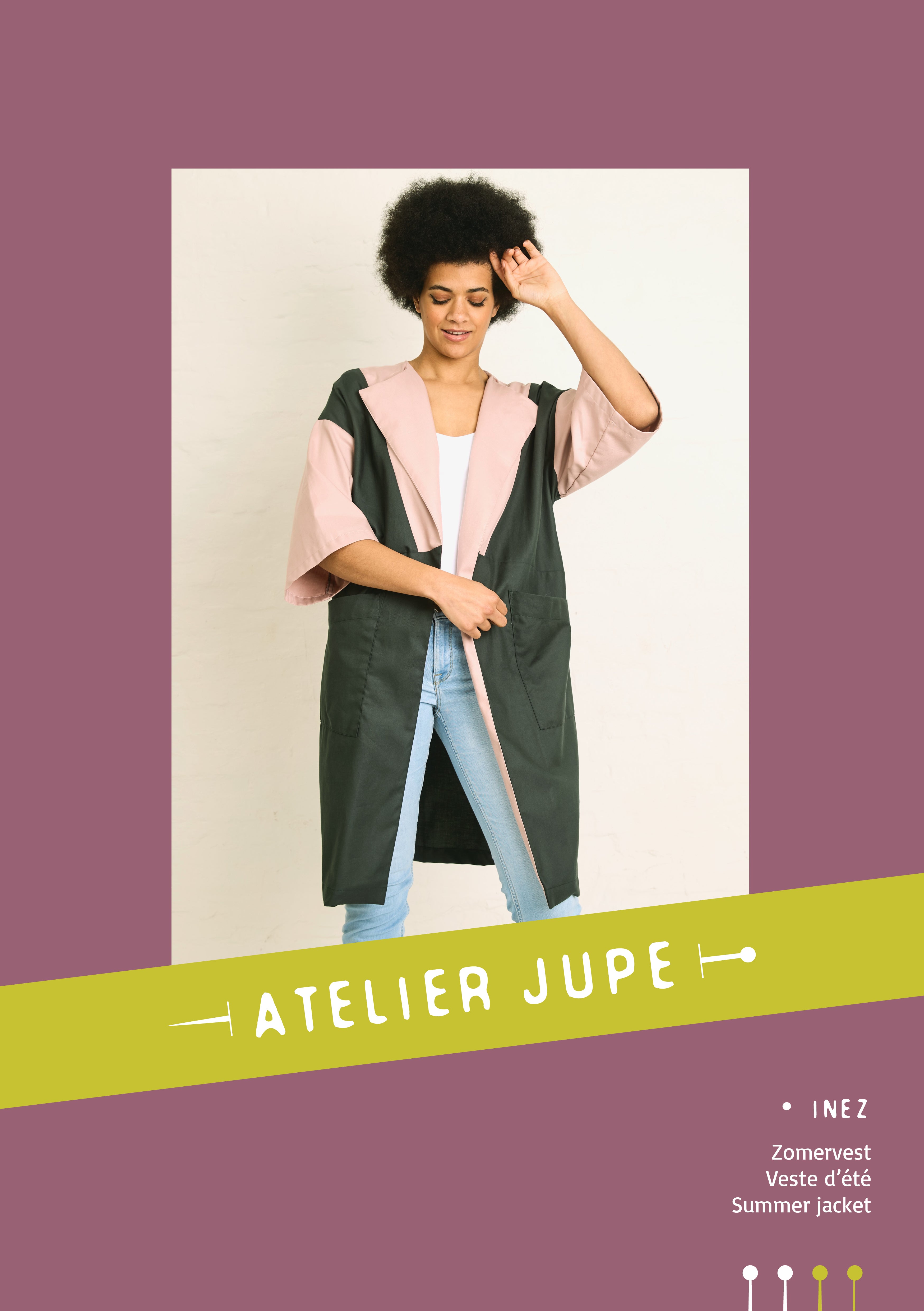 Inez is een zomerse vest die je makkelijk aantrekt en heel leuk combineert met een jeans en top. Door de geometrische vlakken voor- en achteraan heb je de mogelijkheid tot een leuke color block. Het patroon leent zich voor effen stoffen, maar je maakt het even goed in een print voor een kimono-geïnspireerd kledingstuk. Inez heeft grote, opgestikte zakken en een subtiele overslagkraag. De aangesneden mouwen zijn halflang en breed.