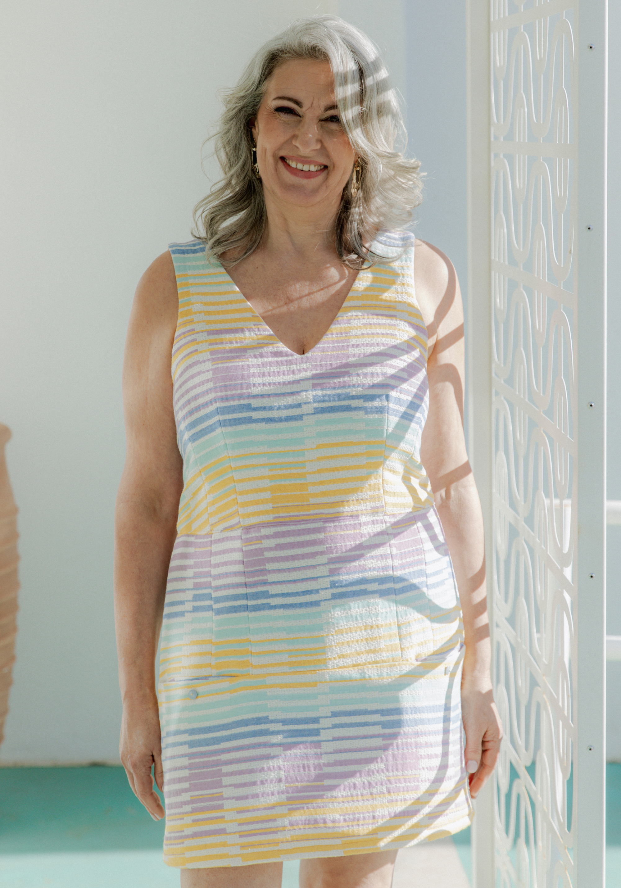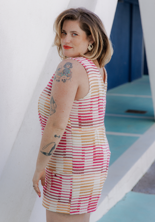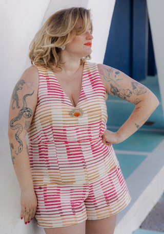 Elegant, comfortabel en vrouwelijk, met een spel van snitten en nepen die zorgen voor een perfecte val en een nauwkeurige lijn — de COSMOPOLITAN playsuit/jurk wordt het paradepaardje van je garderobe. De V-hals zowel aan de voor- als achterkant en de zakken verborgen onder het inzetstuk geven het geheel een moderne uitstraling. Het kledingstuk heeft een onzichtbare rits in de rug en de borst is volledig gevoerd voor een vlekkeloze afwerking. COSMOPOLITAN is verkrijgbaar in een makkelijk draagbare lage halslijn versie, of in een ruime tuinbroekstijl met lage halslijn, ideaal om te combineren met al je topjes, of om direct op de huid te dragen!