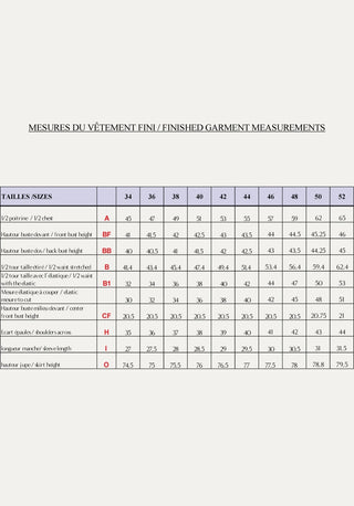 Voor deze versie van de jurk is de hoeveelheid stof anders omdat het schelpkant een specifieke draairichting heeft. Het patroon wordt geplaatst met de stof gevouwen, op een hoogte van 140 cm, en de benodigde hoeveelheden stof zijn: 2,80 m voor maat 34-36, 3 m voor maat 38-44 en 3,30 m voor maat 46-52. De jurk is volledig gevoerd op de rok en het voorste lijfje, volgens de informatie in de brochure (montagevolgorde en hoeveelheid voeringstof, alles wordt uitgelegd). De voering is gesneden uit onze katoenen voile.