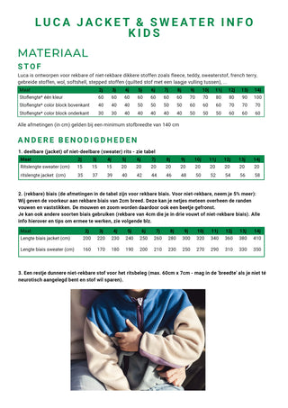 Luca is ontworpen voor rekbare of niet-rekbare dikkere stoffen zoals fleece, teddy, sweaterstof, french terry, gebreide stoffen, wol, softshell, stepped stoffen (quilted stof met een laagje vulling tussen), …
