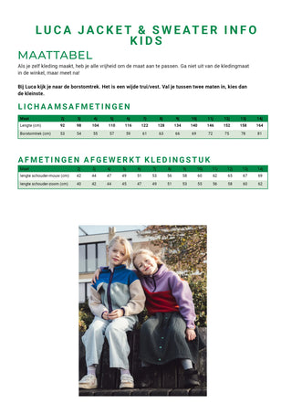 Luca is een patroon voor een unisex sweater of jacket met afhangende mouwen en een kraag. De zoom en mouwen worden afgewerkt met (rekbare) biais. Ook de voorkant naast de rits en de kraag worden afgewerkt met biais. Kies voor het jacket dat helemaal opengaat tot beneden of naai een trui waarbij de rits half opengaat. Luca leent zich perfect tot color blocking met de naad op het achterpand, voorpand en de mouw. Tussen de naad op het voorpand zit een zakflapje. De rits heeft een ritsbeleg dat tijdens het dragen achter de rits zit.